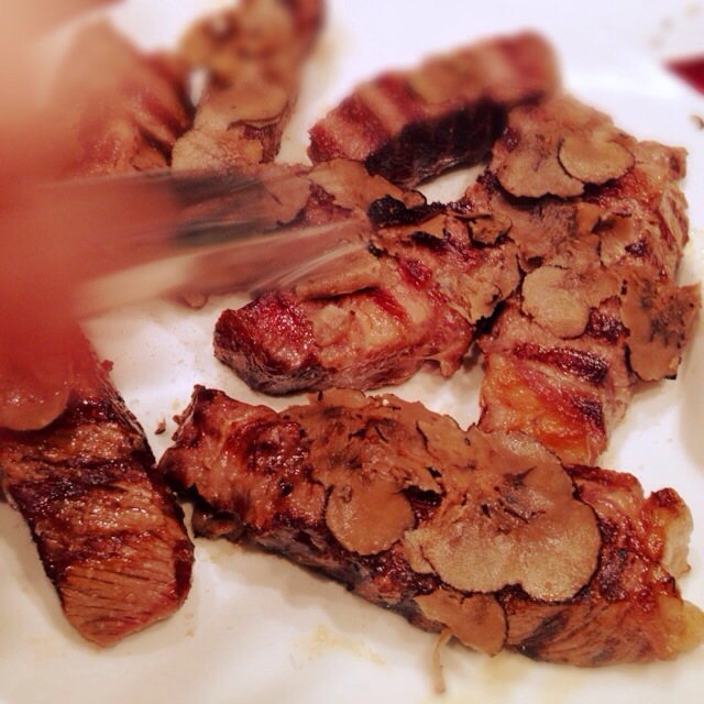 因為還是很難掌握牛排的熟度,就是不夠純熟,也因為我爸要求切三公分,煎好一塊要花太多時間,於是我們就買他們切成長條的一條條,放在鐵盤上煎,就煎成這樣囉!!! 我覺得鹽對於牛肉來說是一個很重要的東西,可以提味增加肉的鮮甜,而這次比較特別的就是我們加了[黑色松露],松露其實就是要吃它的香氣,尤其是他經過牛肉的熱氣,蒸出來的香氣,你會覺得不可思議的美味。我曾經吃過一次蒸出來吃起來的口味就像是乾煎鵝肝的味道,讓我不知的唱出鵝鵝交響曲,不可思議! 這也就是為什麼大家這麼喜歡松露。 除了大口吃肉之外,還要配上紅酒來中和一下油油濃濃的牛肉味,當然建議喝比較dry的美國紅酒或是搭配胡椒的辛香料味的澳洲Syrah紅酒,法國紅酒好喝的都太貴不值得,美洲美國或是智利的價格適合又濃郁配上牛排恰恰好,澳洲Syrah與CS一起混的紅酒也很搭。 吃肉配紅酒真的才是人生!! C’est la Vie