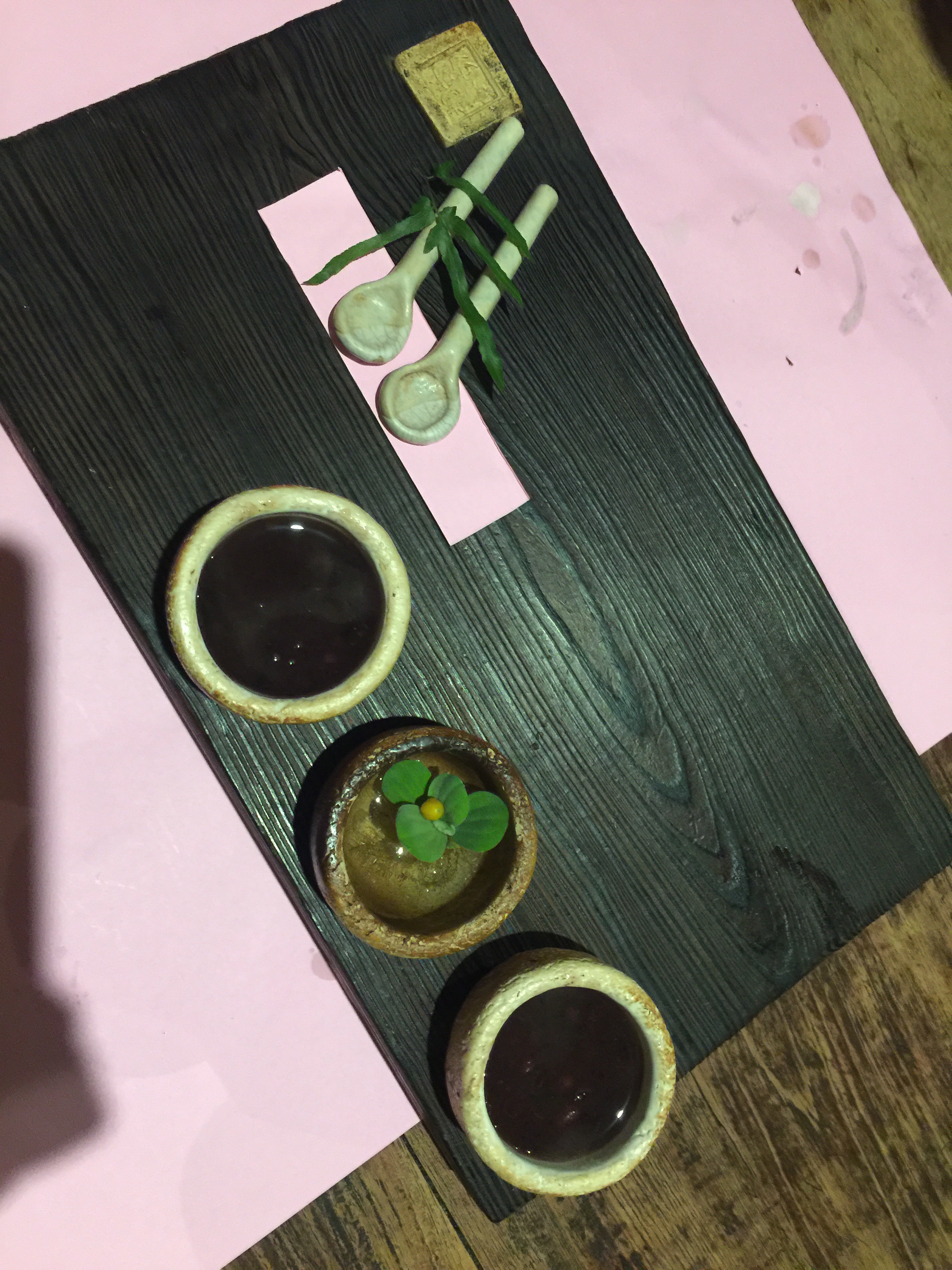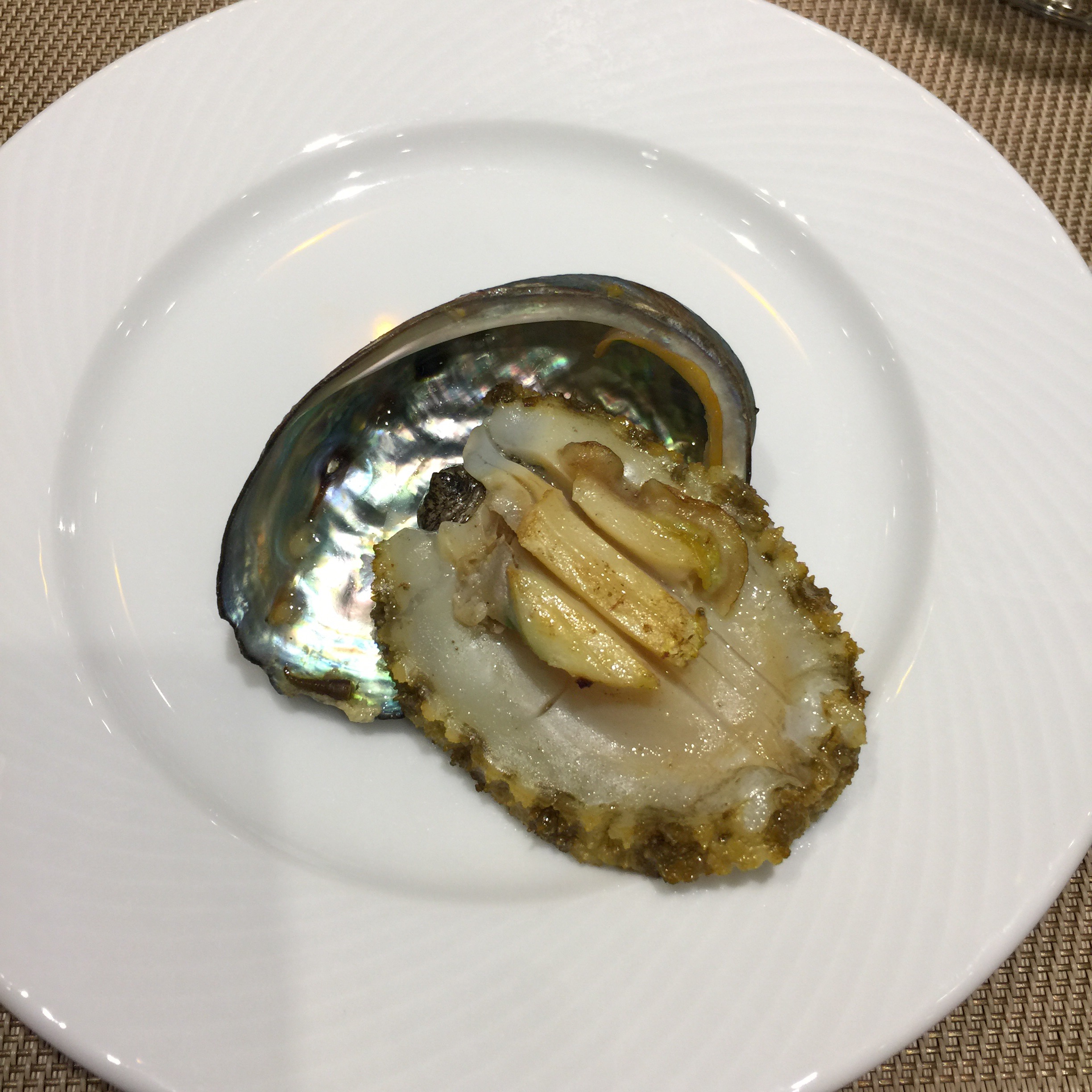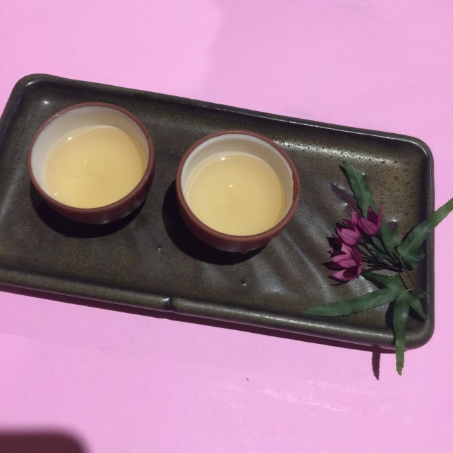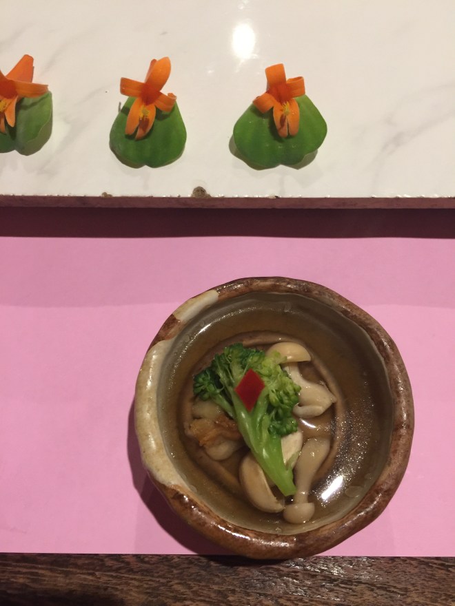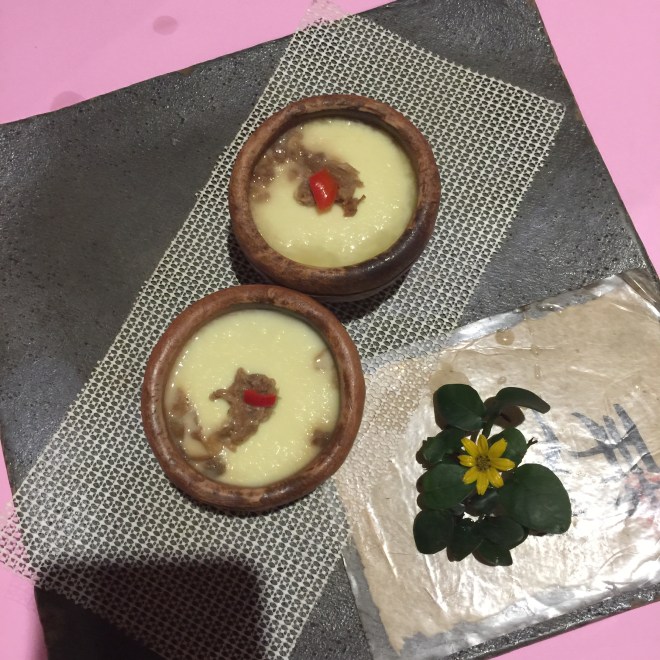 第一道開胃菜(甜玉米汁,日本的玉米超級甜的,是超級喔!主廚說他就只是把玉米拿去打成汁,如此的簡單。另外一個是鹹派,還好沒啥特別的)開胃菜給我們這麼有點飽足感的東西,不知道是為了什麼? 哈