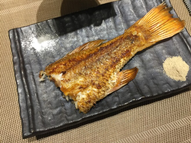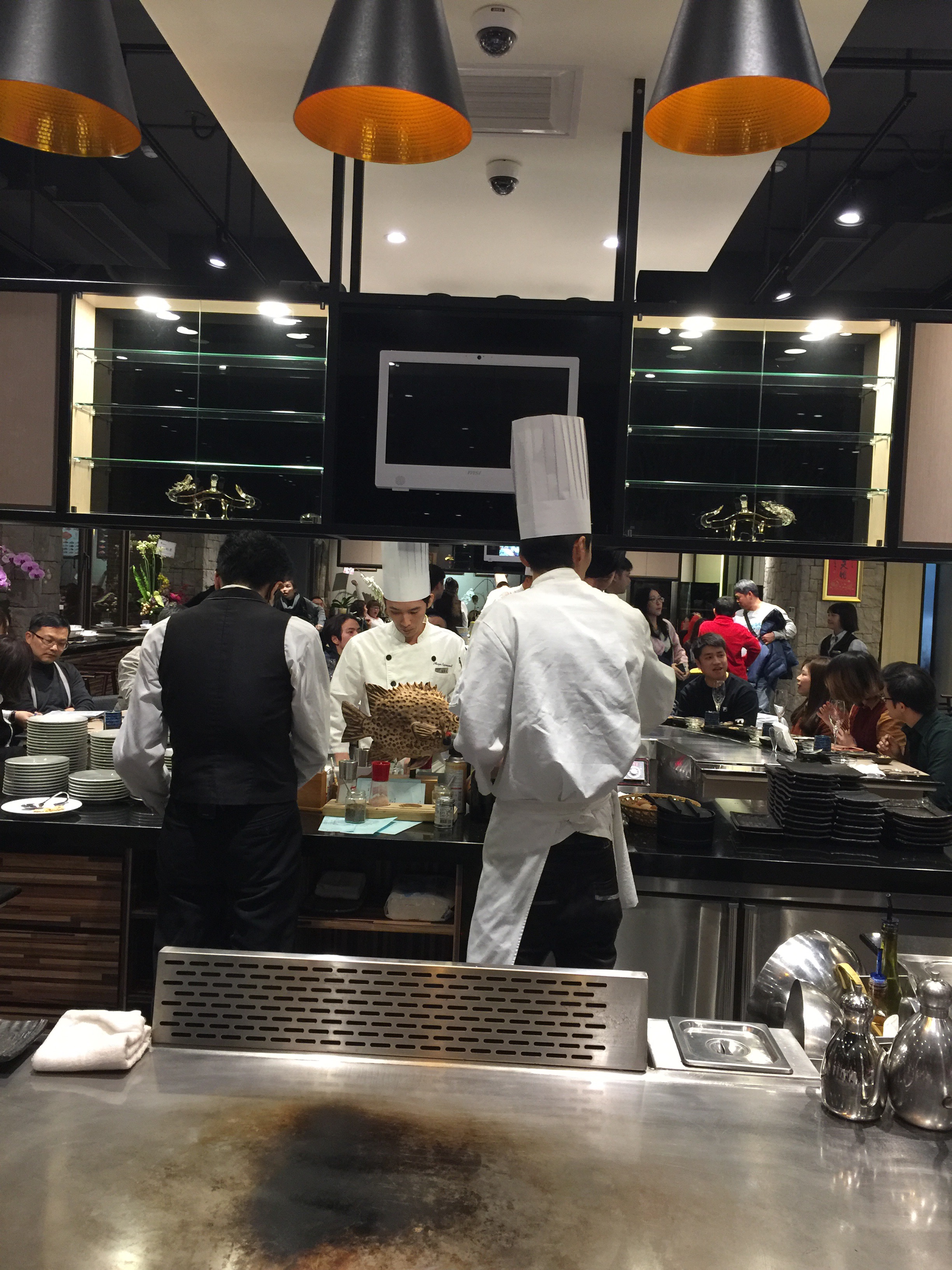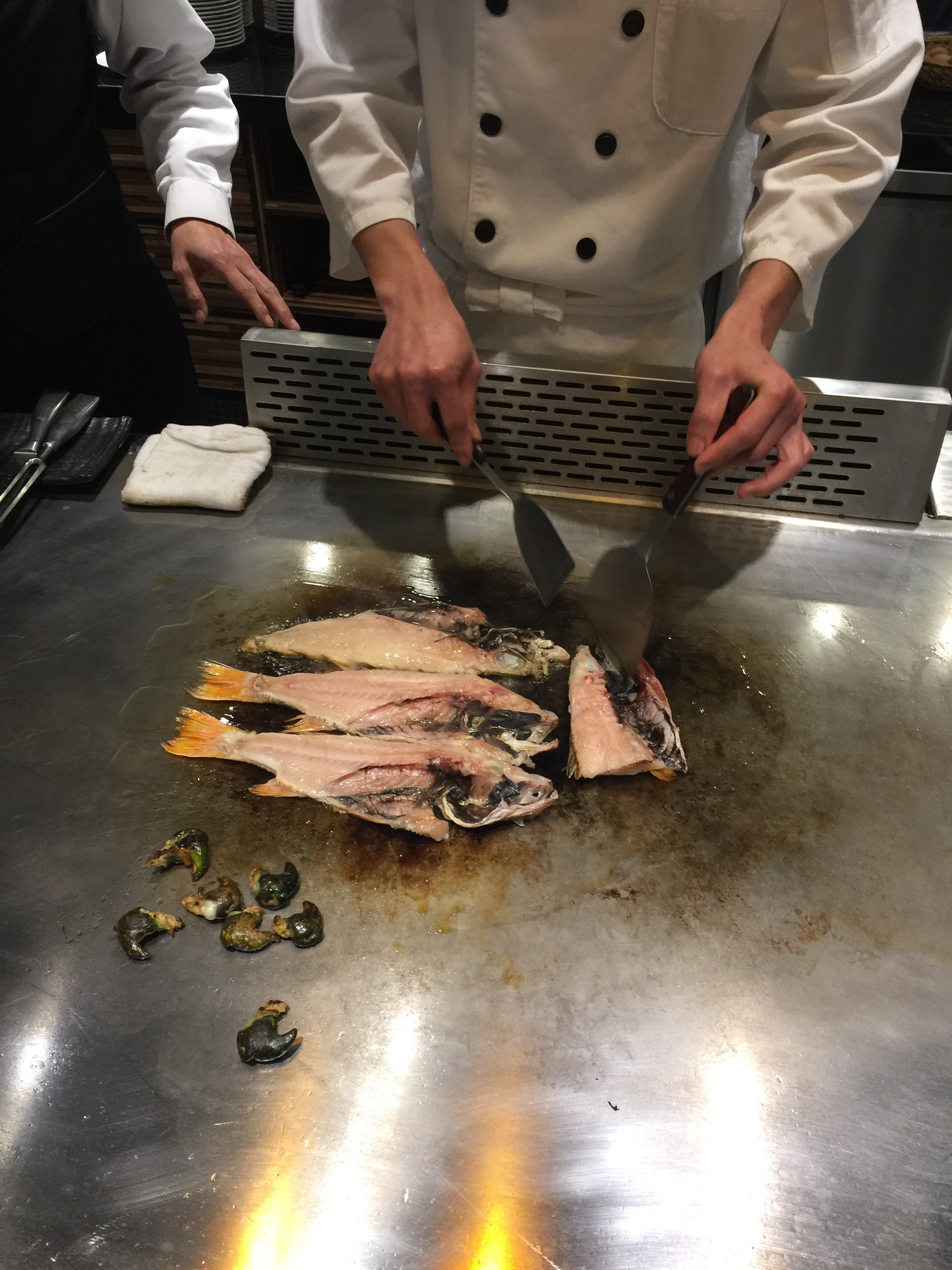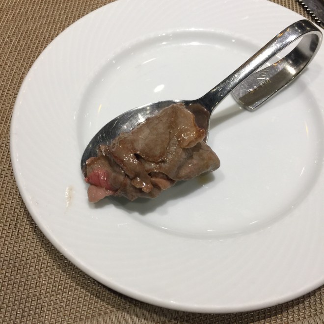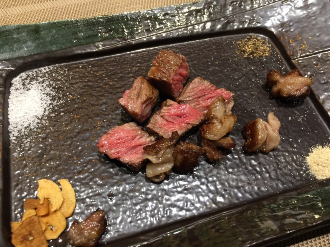 牛肉會是在我們面前烹調,在吧檯的中間有一個火爐好像是炭,我有點忘了…主廚會現場料理給你看,邊烤邊煎看到油煙濃濃就知道這牛肉油脂分布豐富!而且煎牛排他花了很多時間!煎好又讓牛肉休息,再煎來回兩次多吧,很用心。