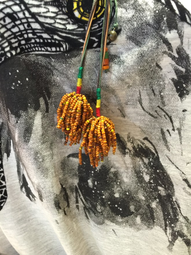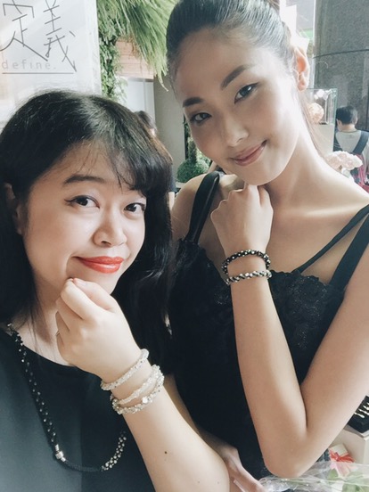 當時她拿衣服到來我家,因為我當時正在整理我的樣品手鍊,在我換衣服的同時,她幫我的手鍊一整組一整組相同色系放好一堆一堆,我一出來看到她的整理後的手鍊,可以感受到她對於色系美感的直覺,真的很厲害,設計師的美感從小細節就可以發現。整理好後,我們就找地方拍照,但是天氣實在太熱,然後我那時候實在太胖,照片我就給大家在電梯間拍的照片。