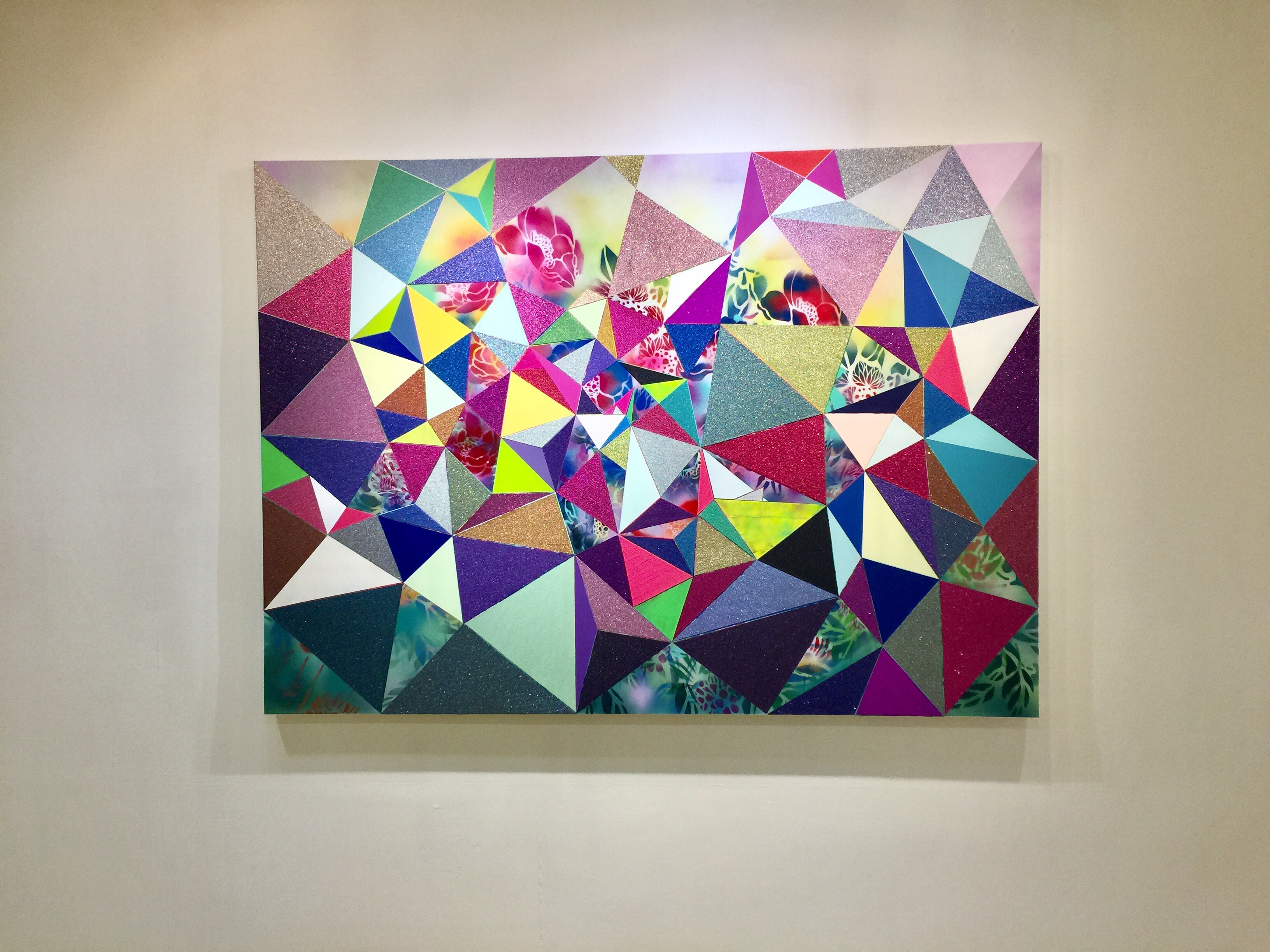 ㄧ進門的巨幅的創作,底部是以牡丹各式花卉以噴漆的手法呈現,再以三角色塊讓視覺無限帶入妳的眼睛。金屬色粉的使用,在燈光下折射出精緻的光彩,如果家中有空間可以掛置,會是一個很棒的蒐藏。