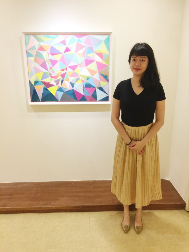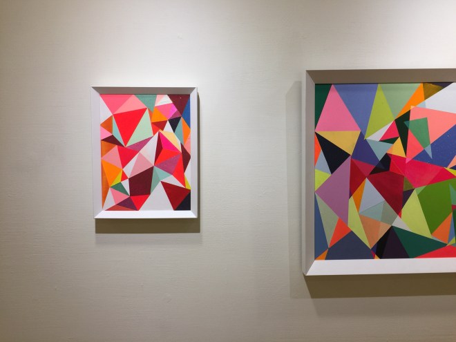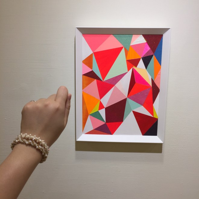 以三角型與幾何圖案為設計元素,透過色彩建構出獨特的有層次的畫面。 用色繽紛大膽,這次一系列作品融入的金屬色調,在燈光下更顯閃爍。 她的畫作放在家裡會讓人心情愉悅,而且她的配色真的很厲害。