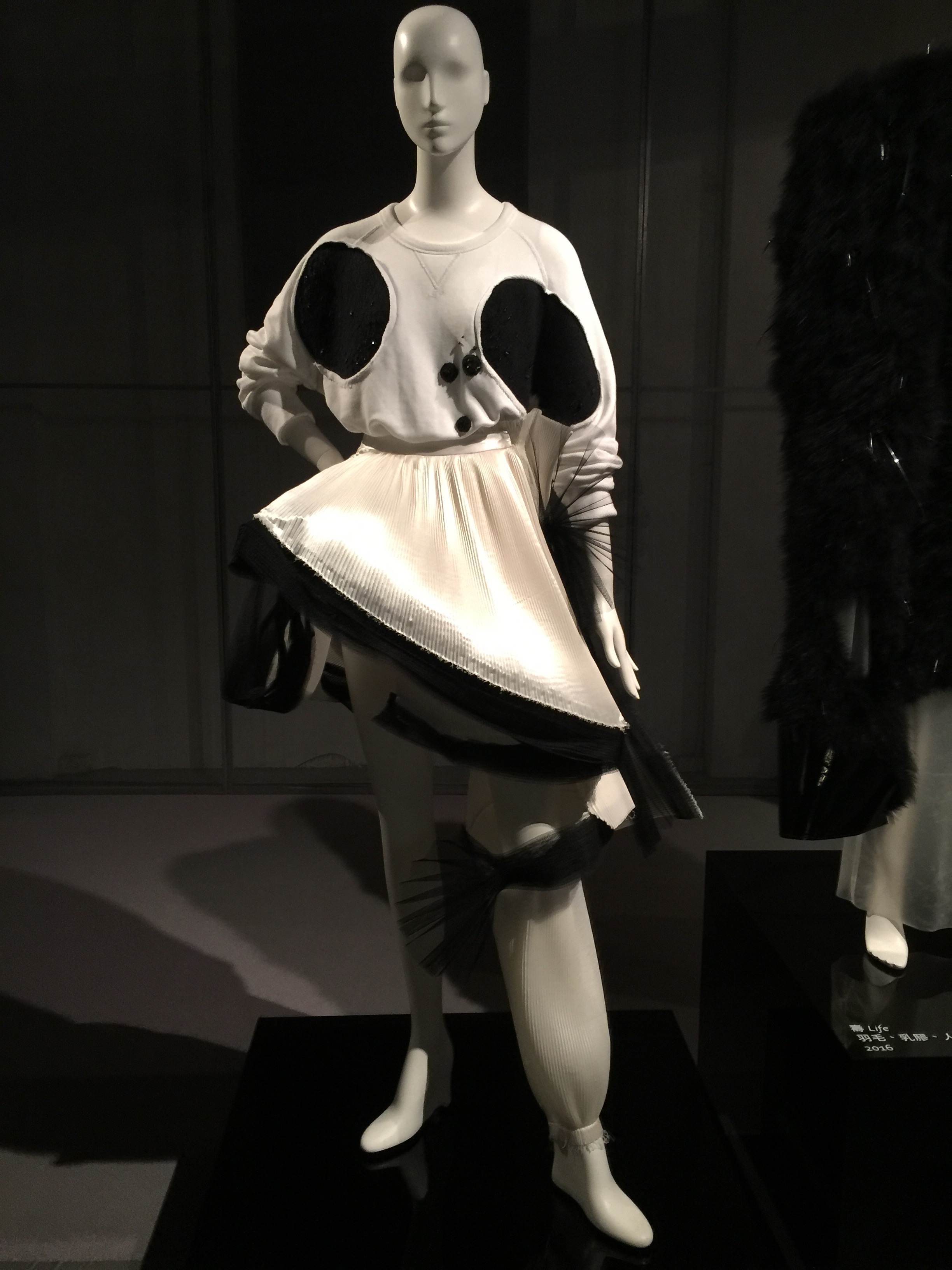 將董陽孜的點畫書體拆解放大,藉由空間透視去觀看作品,以不同技法呈現出筆墨動態的凝結畫面,讓平面的字立體化,在表達線條的同時帶出服裝元素,將超現實的結構用服裝細節合理化。