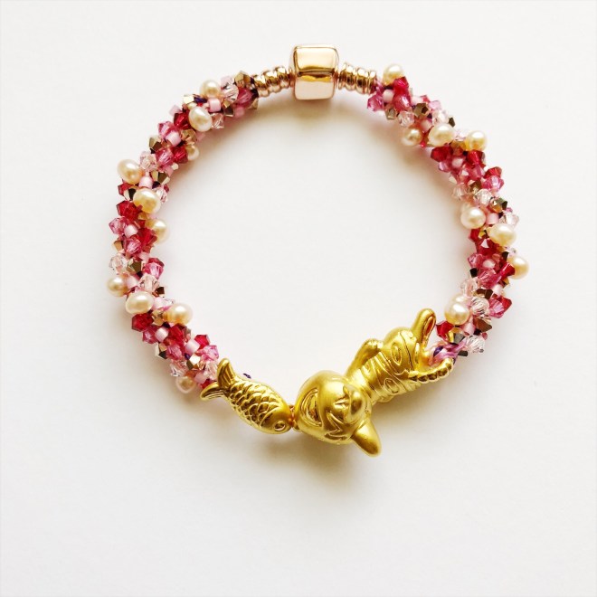 前一陣子,幫客人改了黃金手鍊,重新編織成水晶的感覺。下圖是客人提供的手鍊,中間是黃金的貓吃魚還是貓親魚,很可愛。