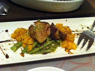 鴨肝– 它的盤子有熱過,所以可以保溫,鴨肝乾煎味道很香濃郁,在配上芒果丁和細切的四季豆,一點粗鹽,一點酸甜的芒果配上濃郁的鴨肝,兩個碰撞出來的口感相當的棒。如果可以在吃這道的時候喝杯紅酒,去去油膩會更好。