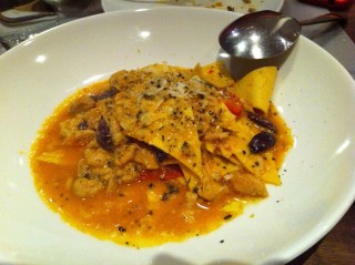 手工麵– 裡面加入olive切片,雞肉塊加上紅甜椒和番茄一起煮,這個麵不同於一般的麵條,是一片片三角形麵皮( Lasagna Doppia Riccia ),應該是就是作千層麵的麵切成三角形。