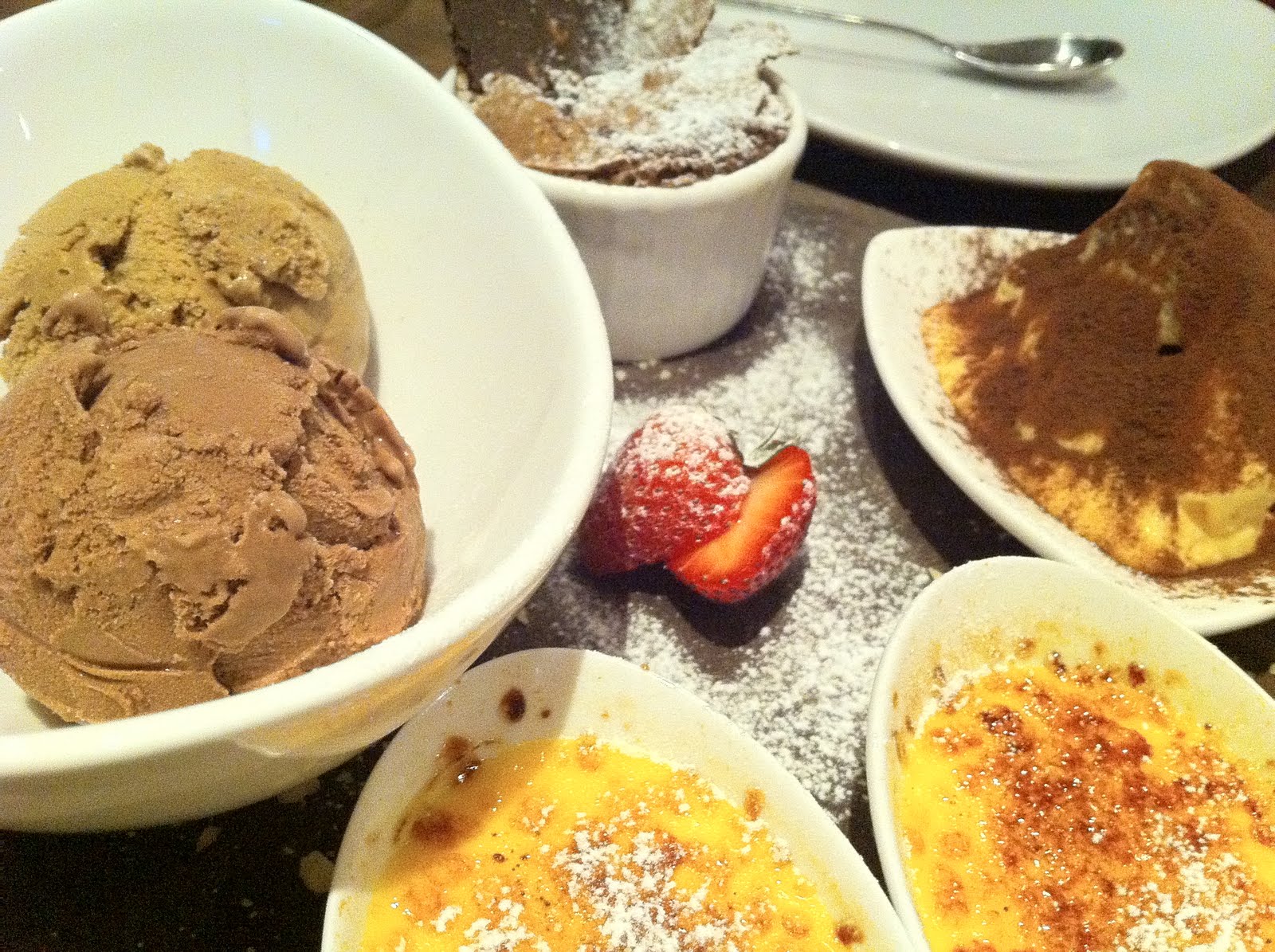 雙人甜點組– 有一份烤熱巧克力、兩份芒果烤布雷、提拉米蘇、兩球冰淇淋(苦咖啡、巧克力口味) 這份甜點套餐相當的滿足,各種甜點都可以吃到,烤巧克力有點甜,所以搭配苦咖啡口味的巧克力剛剛好,再來芒果布雷上面的焦糖厚度剛好,份量不會太多。提拉米蘇味道濃郁,搭配海綿蛋糕、巧克力粉相當好吃。