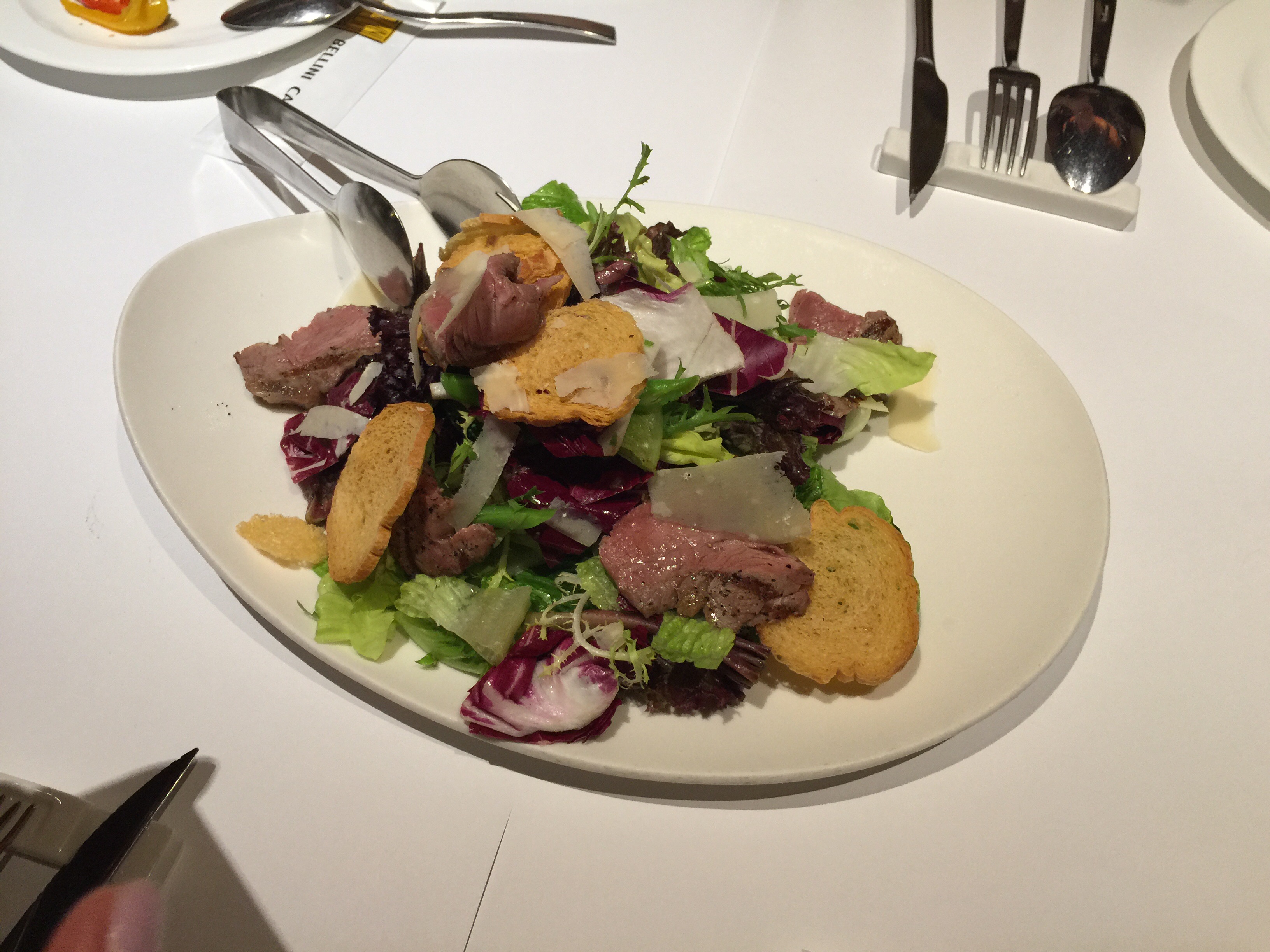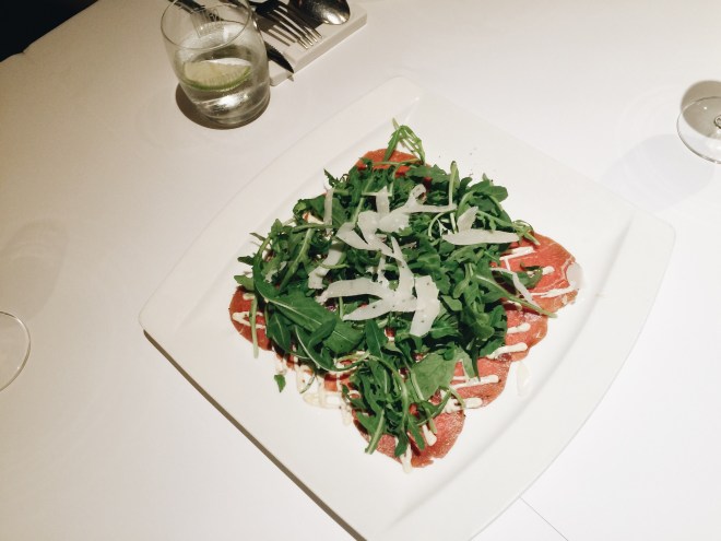 義式生牛肉(綠色是芝麻葉,吃起來有點辛香料的感覺,這菜時常在國外吃到,台灣還不常見,下次大家可以試試看這個味道,芝麻葉搭配肉,非常好吃,國外都是這樣的吃法)