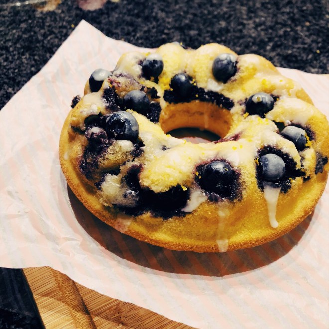 最後把糖粉淋在蛋糕體上,掛下一些金桔皮在蛋糕表面,美美香香。藍莓烤了後會變成空洞,我就填入新鮮的藍莓,這樣也很可愛,如照片。