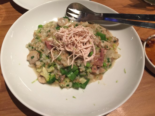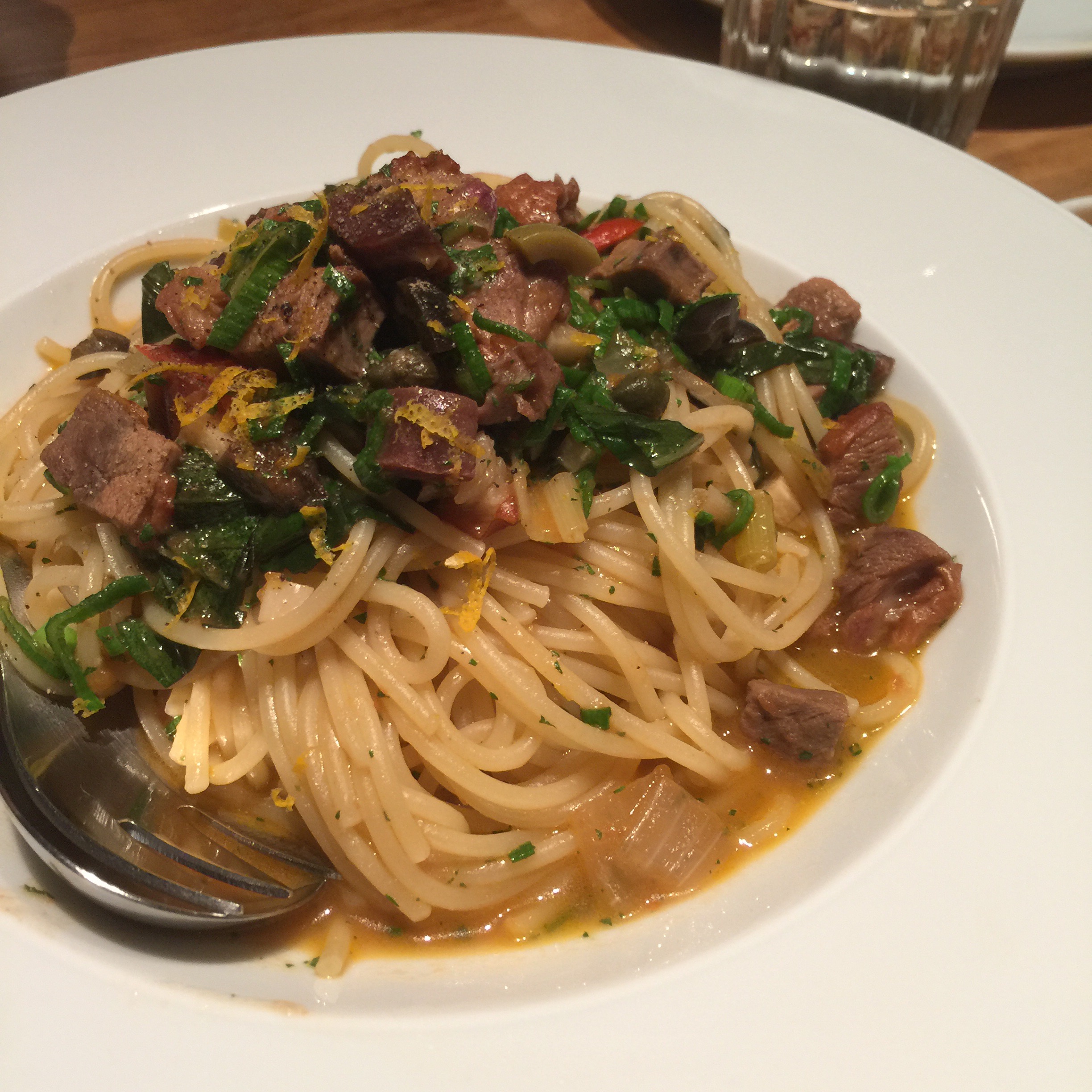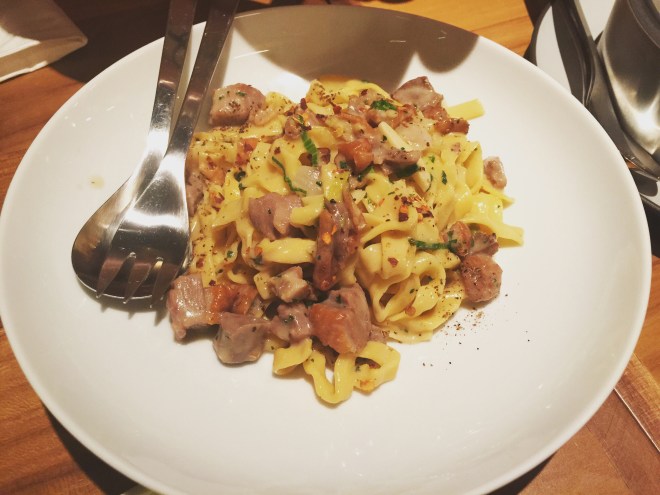 一種西港合併的感覺,就是港式燒鴨口味配上義大利麵的麵條。 還記得,以前歷史課本有學過「中體西用」貓下去的菜,讓我就有這樣的感覺。