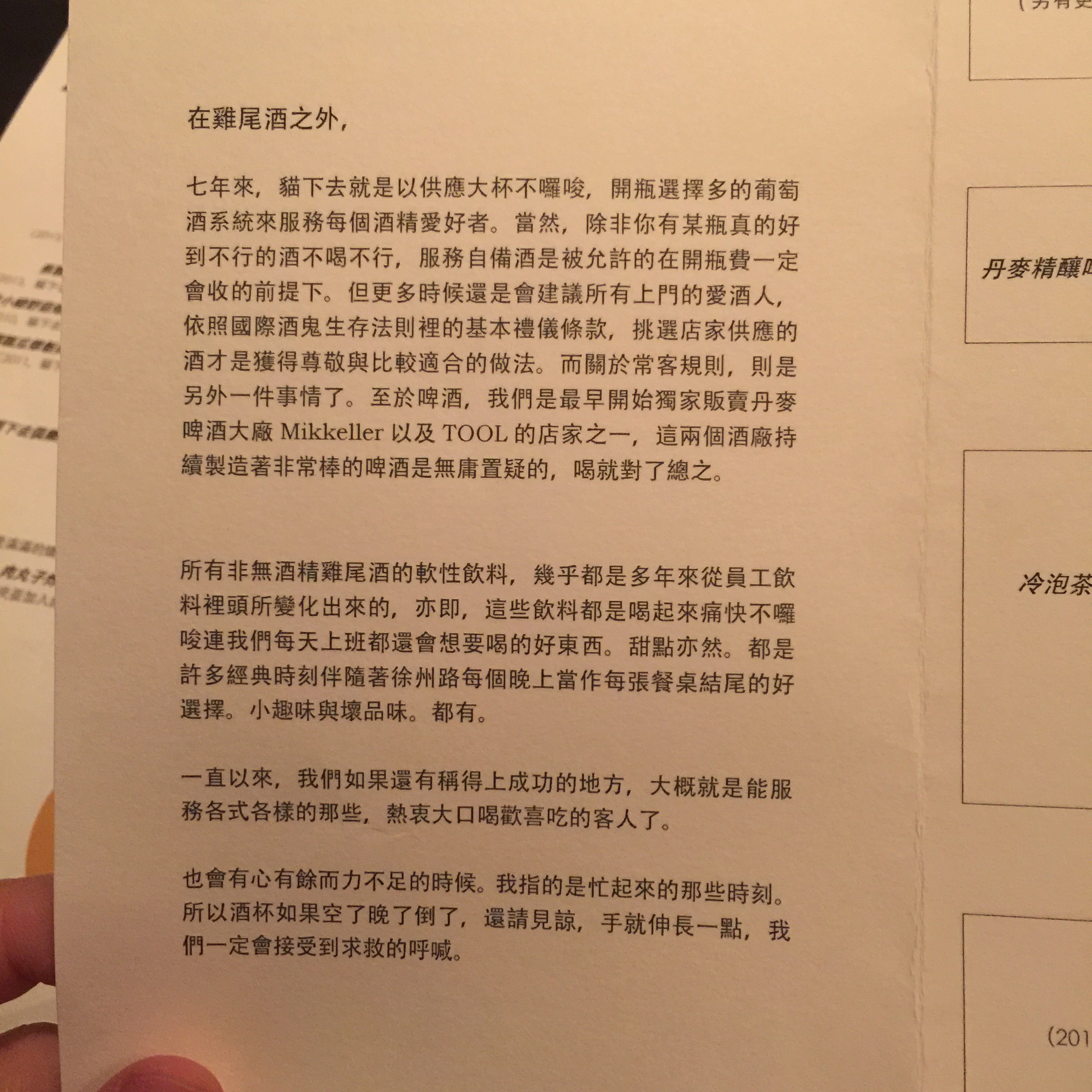 新的菜單,當然有新的方向感~ 貓下去的部落格 裡面有很多老闆很酷的文字,應該是貓下去後,有很多類似的文青?風格的菜單在餐廳界流傳,還有西台融合的料理,想要加一點台灣元素的感覺的菜,最近也吃了幾間,個人覺得貓下去還是經典。 大家可以陸續去感受一下這樣的感覺囉。 其實,菜單就是一個最直接與客人溝通的第一印象,我記得國外的menu還有競賽,所以menu是一個很重要的東西。不然經濟學幹嘛有一個成本叫做menu cost。到貓下去吃飯前要先閱讀一下,序,再開始吃!