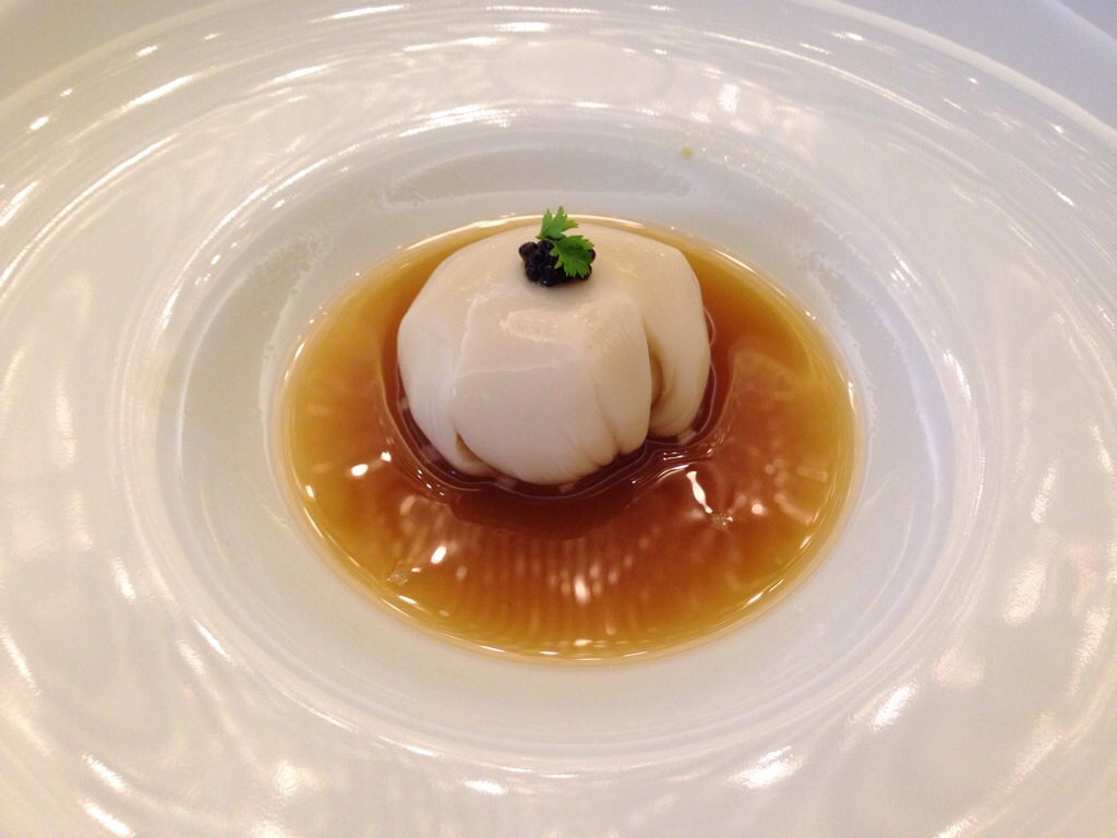 魚 低溫烹調 外裹墨魚醬 旁邊最大片的葉子,吃起來有很可怕的腥味,類似生蠔的味道,只要吃一點點,有點讓人沒有食欲… 由於一開始被說吃吃看那的葉子後,再吃魚,魚就充滿無比的腥味,感覺主廚先生,不懂腥味的可怕性嗎? 唉 沒吃那葉子的時候,一切都還蠻美好的。 吃了那葉子後,感覺魚好像很噁心…嗯,主廚先生你再想什麼呢? 還是我們不太懂。
