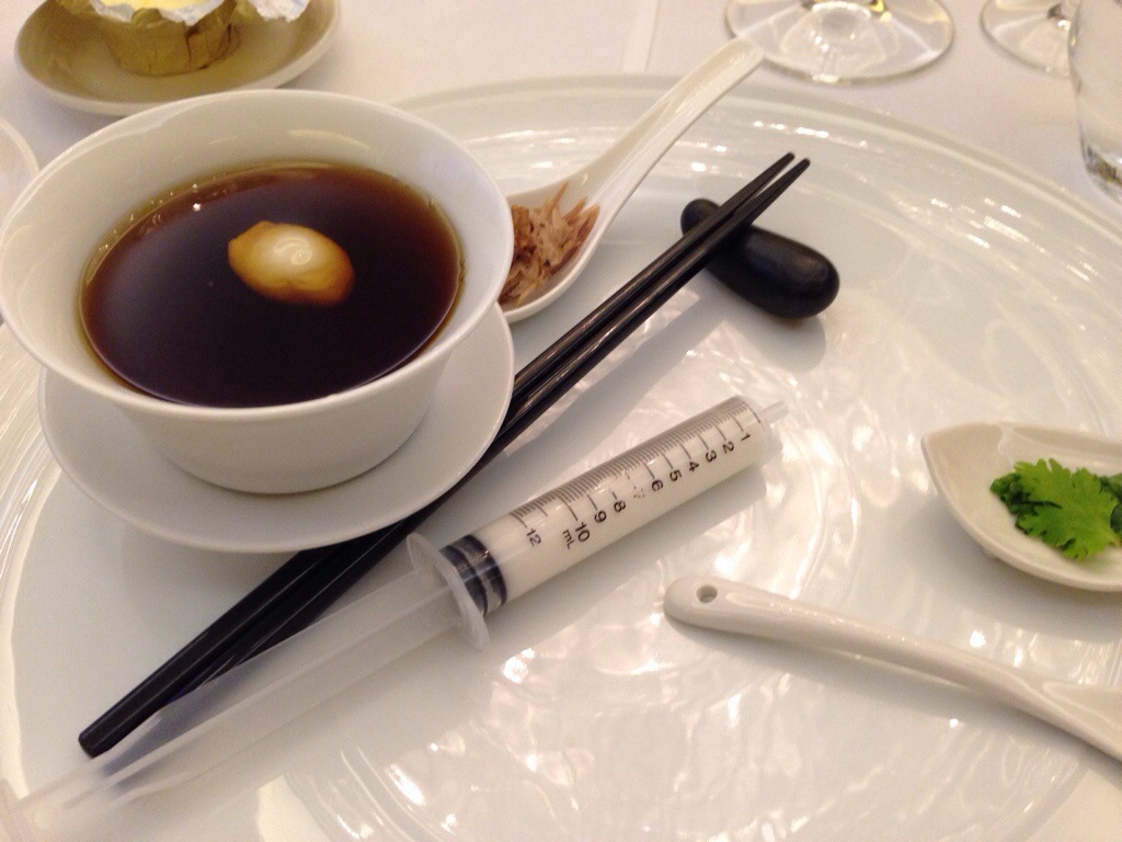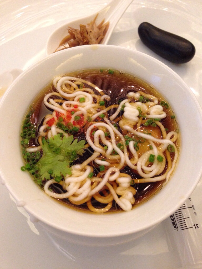 這道是比較趣味的料理,比針管的椰漿做的麵條擠入熱鴨湯中,再搭配一點香料,有一點中式麵條的感覺。
