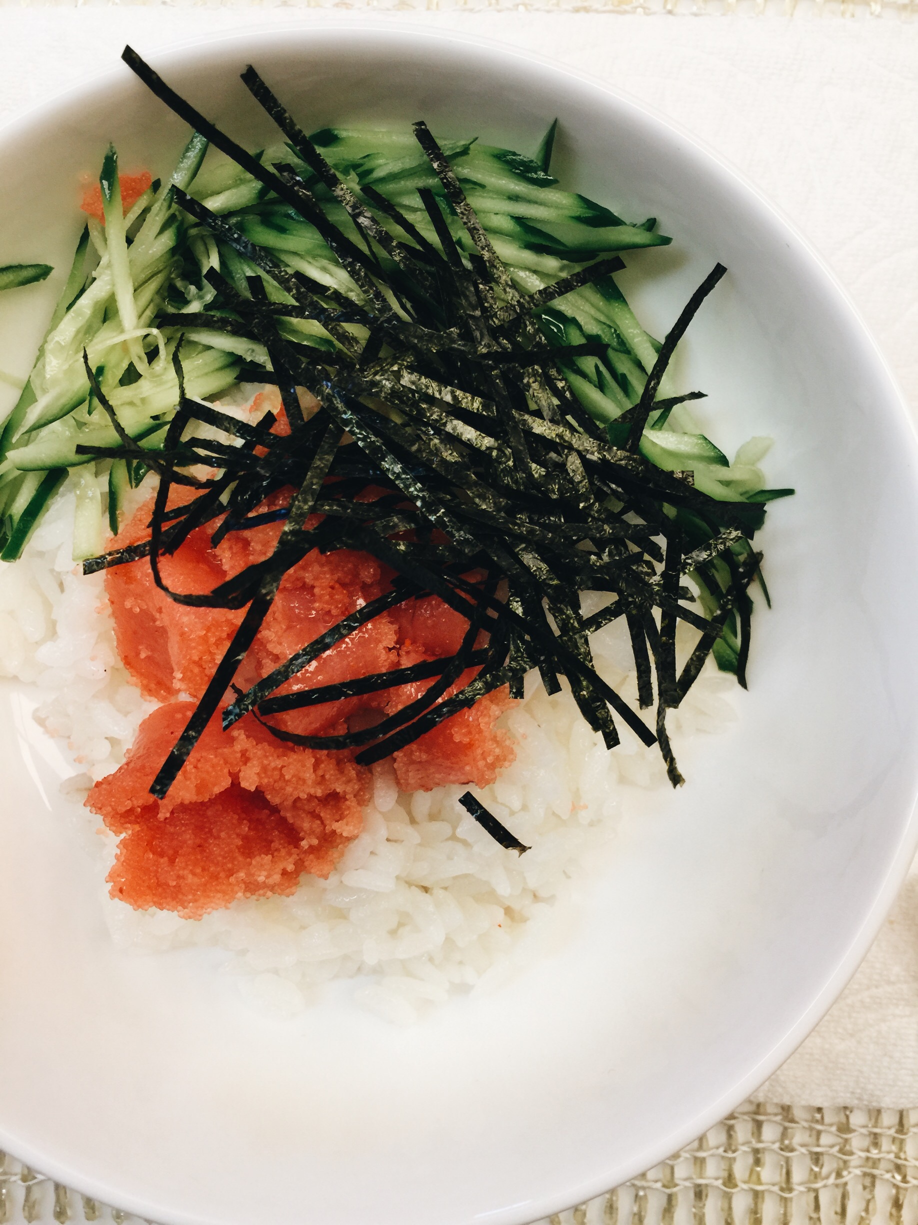 我吃了好幾天的小黃瓜料理菜色,特寫如下,下圖是我的早餐,明太子配上熱飯,感覺天天在吃日本料理,我是…就是去上引水產買了一大盒的明太子,然後就要一直把它給吃完的一種吃飯態度。